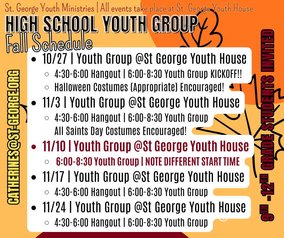 6:30-8:30 is our official 'youth group' time with group games, presentations on all manner of Catholic topics, prayer, and discussion. This year we've talked everything from legitimate defense to stem cell research to tackling tough bible passages to lectio divina on Sunday gospel readings.